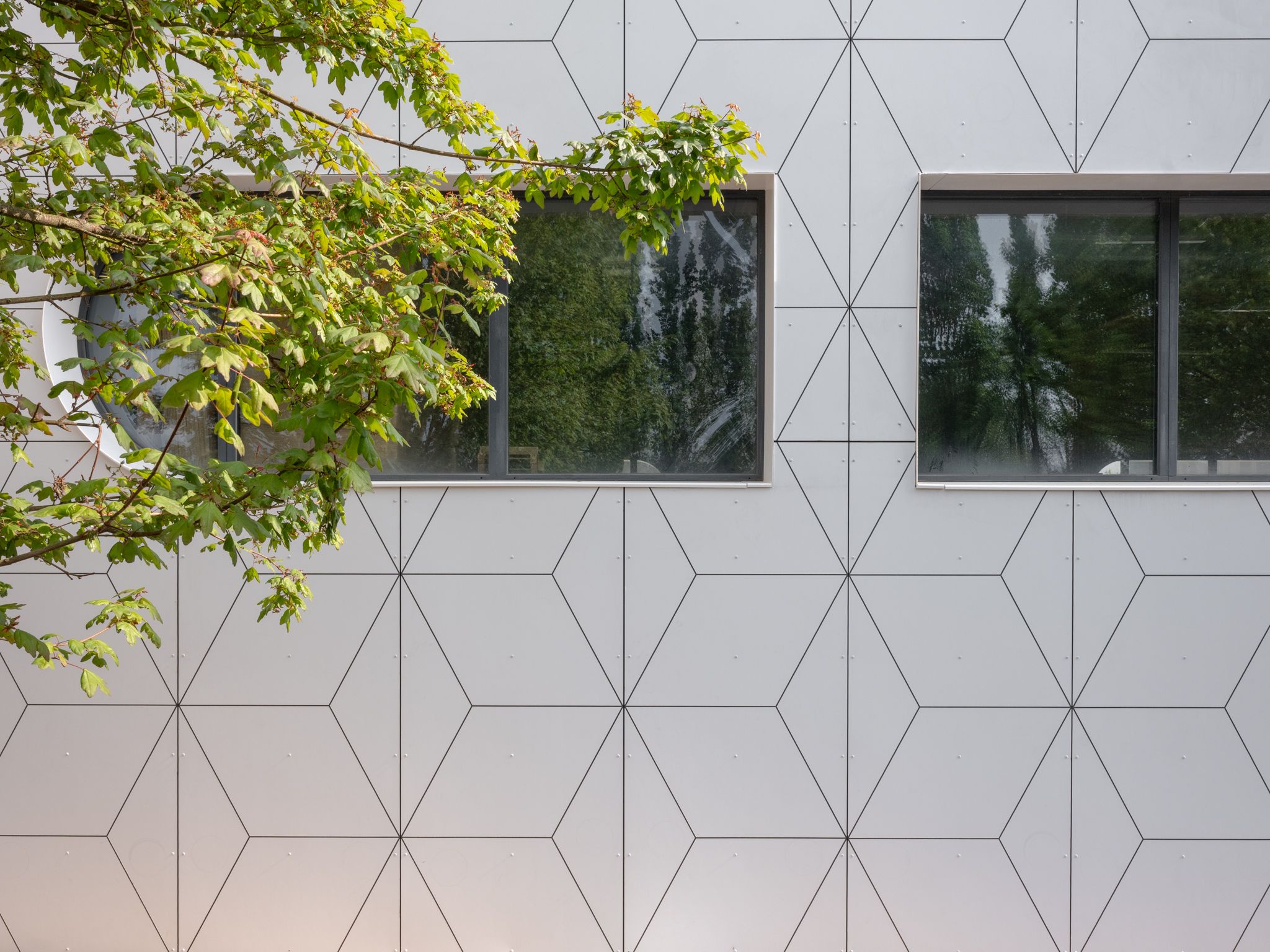 Les façades ont été habillées en panneaux EQUITONE France by Etex [pictura] PA141 teinte Chaux, pour un rendu à la fois graphique et intemporel, fidèle à l’esprit du lieu.