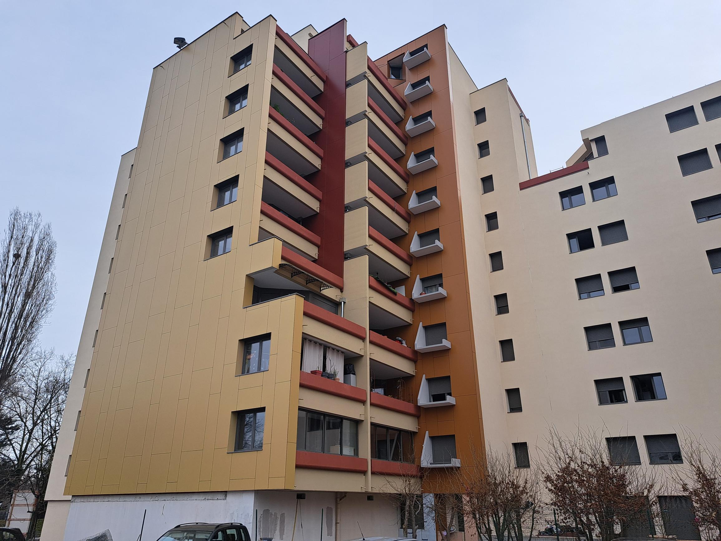 Sur ce chantier réalisé avec Ravaltex, les façades sont habillées de panneaux Rockpanel, posés sur notre ossature TradiCLAD galvanisée.