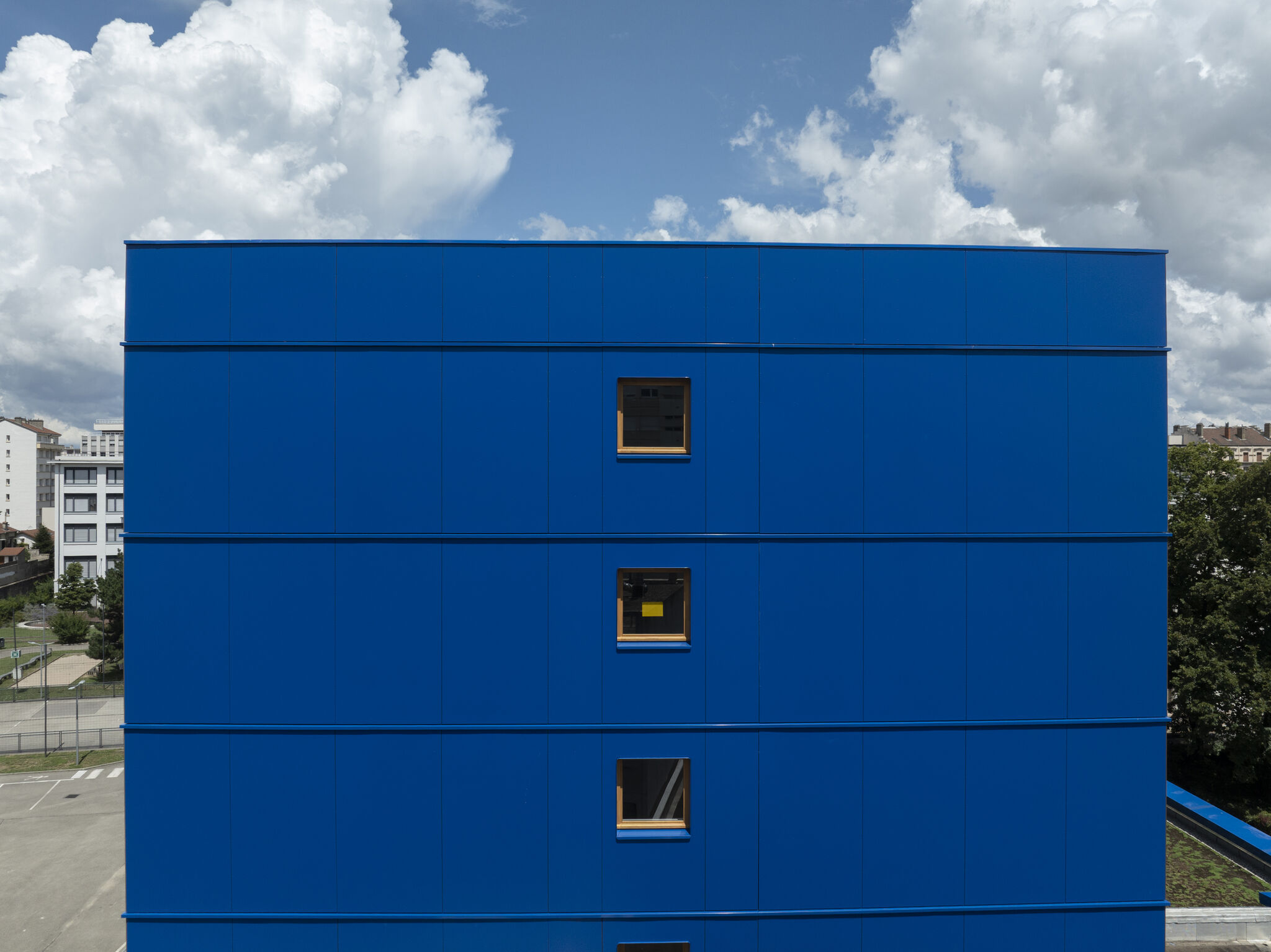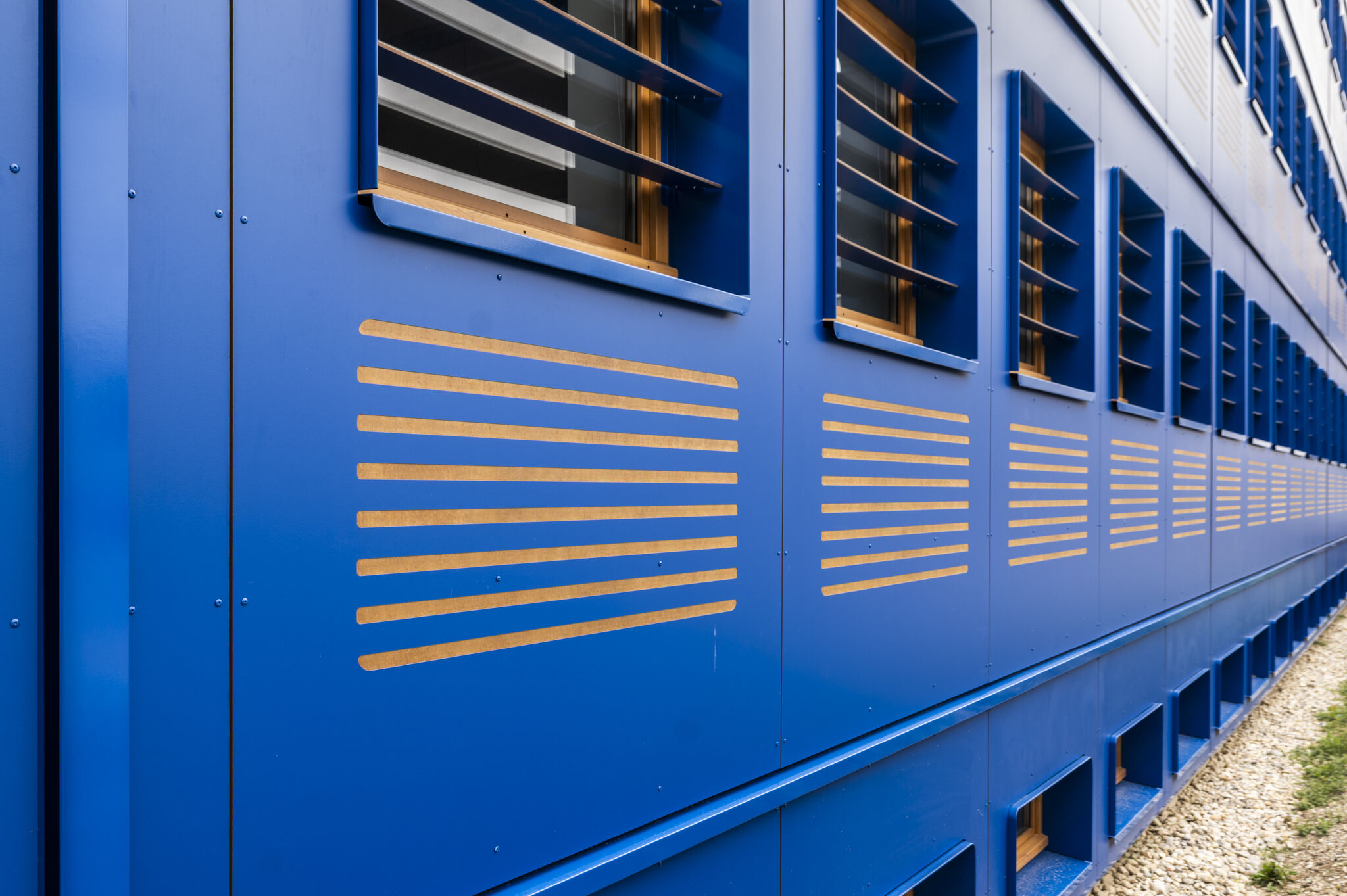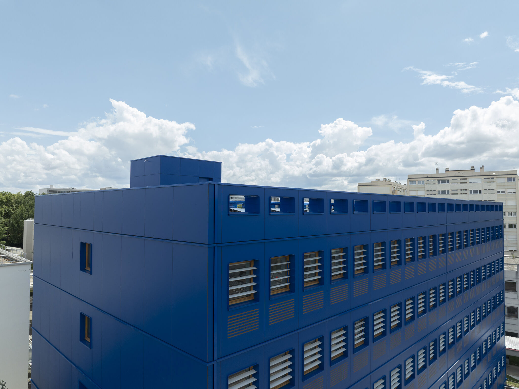 Pour la réhabilitation de l’IUT Gratte-Ciel à Ville de Villeurbanne, nous avons travaillé sur des panneaux Fundermax, soigneusement rainurés et usinés pour former des brise-soleil fonctionnels et esthétiques. Les étagères de lumière sont fixées sur des crémaillères que nous avons conçues. Architecte : Bruno QUIENNE - Supermixx architectes urbanistes. Entreprise de pose : CITINEA. Fabricant ossature bois et préfabrication : Charm'Ossaturee